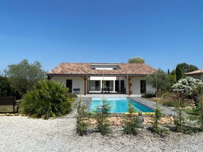 Très jolie maison d'architecte de 169 m2 habitables mais 150 m2 en loi Carrez. Maison formant un U autour de son patio intérieur de 45 m2. Deux beaux espaces de vie : salon de 30 m2 et cuisine-Sam de 30 m2, 3 chambres dont une suite parentale, mezzanine-bureau, chambre d'amis-espace de jeux. Jardin de 960 m2 avec jolie piscine bâtie 9X4, chauffée par PAC, volet électrique, traitement au sel tout automatisé, terrasse en IP. Maison coup de coeur, avec de bonnes prestations : charpente bois traditionnelle, chauffage au sol par pompe à chaleur, menuiseries aluminium, volets aluminium fermetures centralisées, cuisine très bien équipée avec plan de travail en granit noir, de grandes terrasses, construite par des artisans locaux aux normes de la RT2012 avec encore 5 ans de garantie décennale.